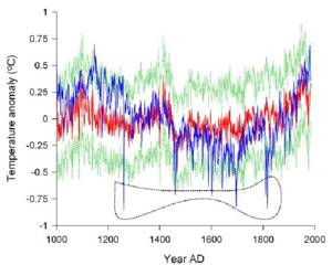 1000年(公元1000年-公元2000年)石笋和树轮集成年平均温度重建数据
